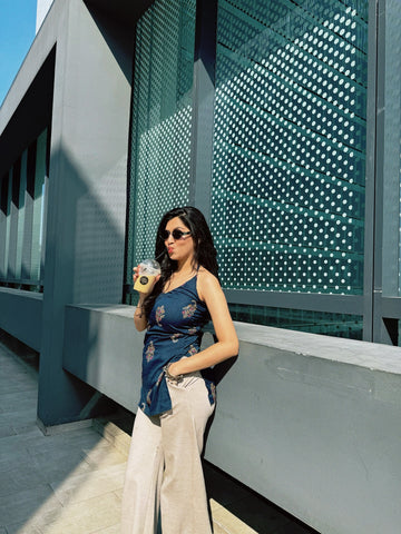 Navy Blue Sleeveless Floral Kurti